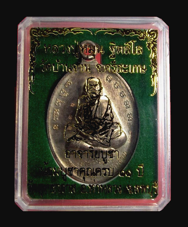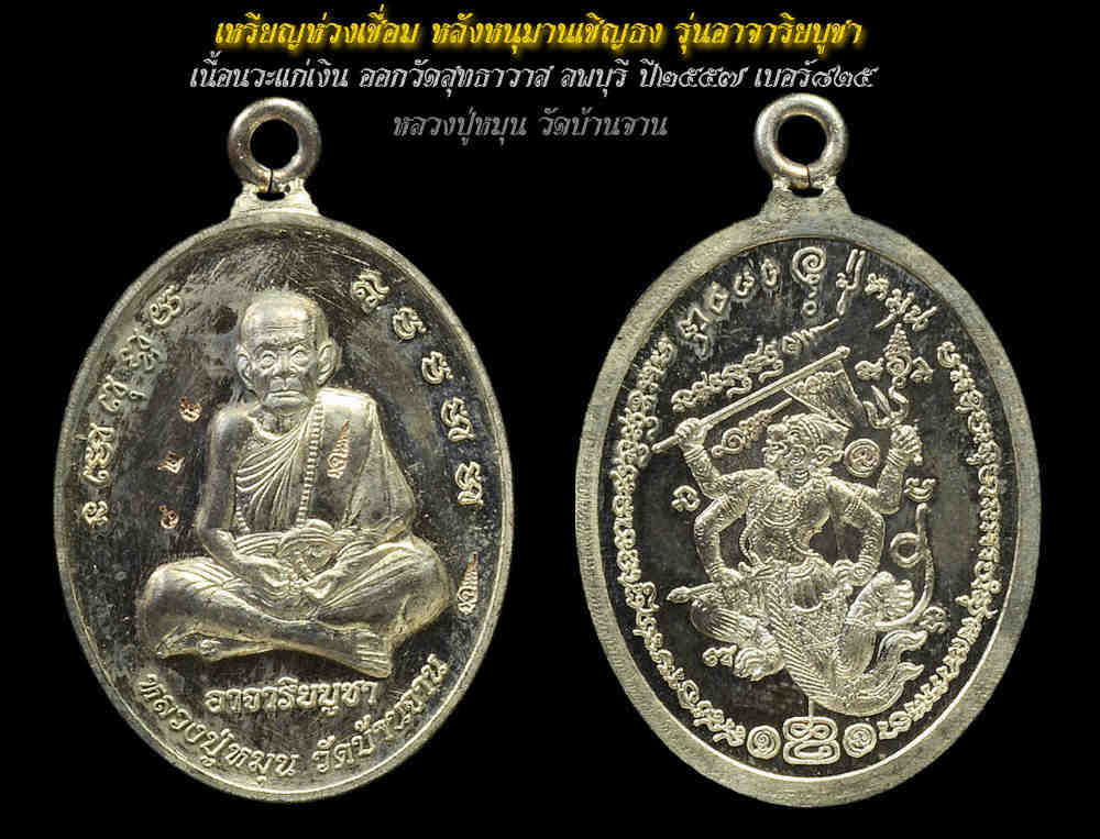 เหรียญห่วงเชื่อม หลังหนุมานเชิญธง เนื้อนวโลหะแก่เงิน หลวงปู่หมุน วัดบ้านจาน หมายเลข๘๒๕ ปี2557 กล่องเดิม