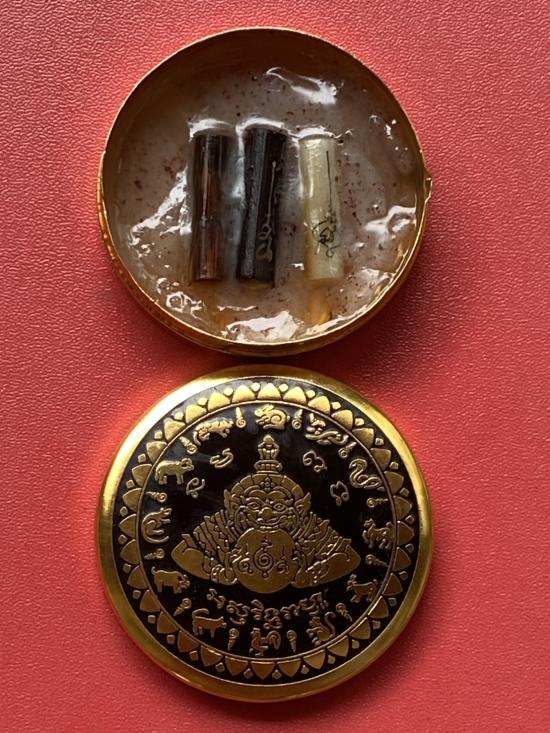เคาะเดียวแดง สีผึ้งพระราหู รุ่น มงคลจักรวาล เนื้อ โลหะชุบทองลงยาสีดำขอบสีดำ ขนาด 5ซม |