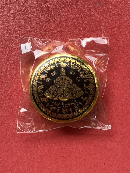 เคาะเดียวแดง สีผึ้งพระราหู รุ่น มงคลจักรวาล เนื้อ โลหะชุบทองลงยาสีดำขอบสีดำ ขนาด 5ซม |