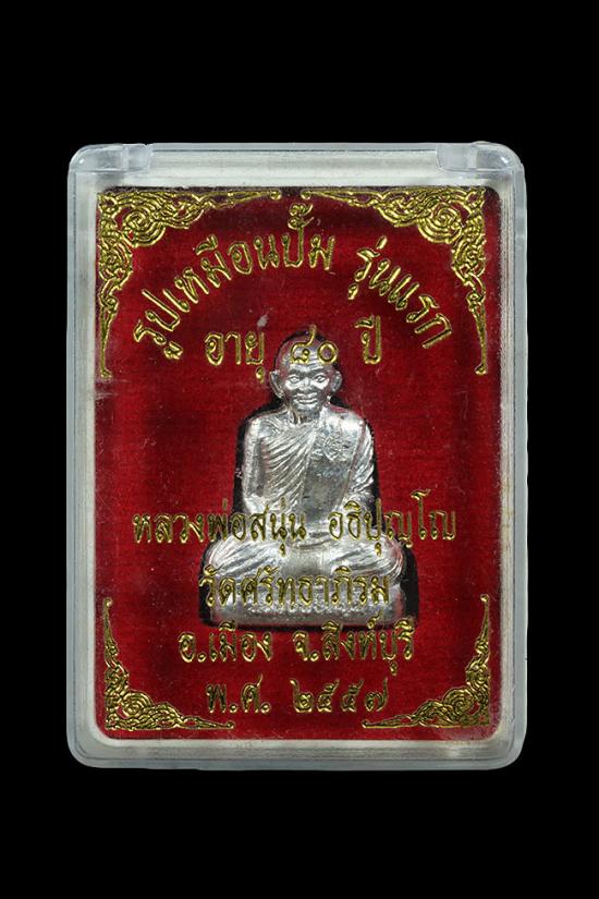 รูปเหมือนปั้ม รุ่นแรก หลวงพ่อสนุ่น วัดศรัทธาภิรม จ.สิงห์บุรี เนื้อเงิน น้ำหนัก 14กรัม
