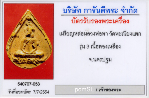 เหรียญหล่อหลวงพ่อทา วัดพะเนียงแตก รุ่น 3 พิมพ์หยดน้ำ เนื้อทองเหลือง จ.นครปฐม ผิวไฟเดิมๆ เต็มพิมพ์ มาพร้อมบัตร G ครับ
