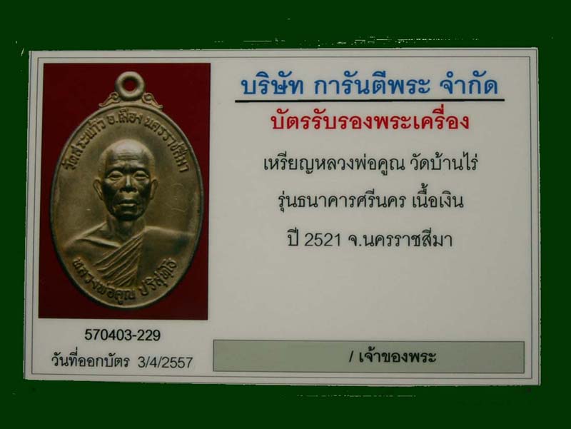 เหรียญหลวงพ่อคูณ วัดบ้านไร่ จ.นครราชสีมา ปี 2521 รุ่นธนาคารศรีนคร เนื้อเงิน
