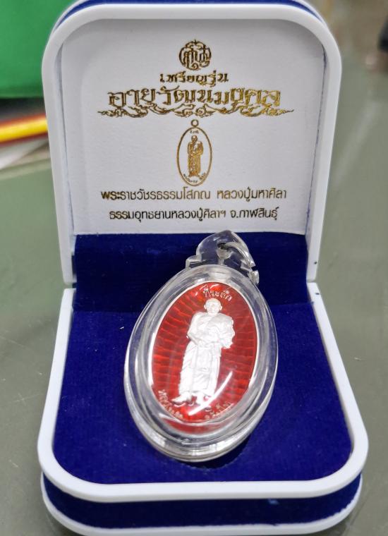 หลวงปู่มหาศิลา สิริจันโท อายุวัฒมงคล81 พิมพ์ยืน เนื้อเงินลงยาแดง เลข 840 กล่องครบ พร้อมเลี่ยมขึ้นคอได้เลยครับ