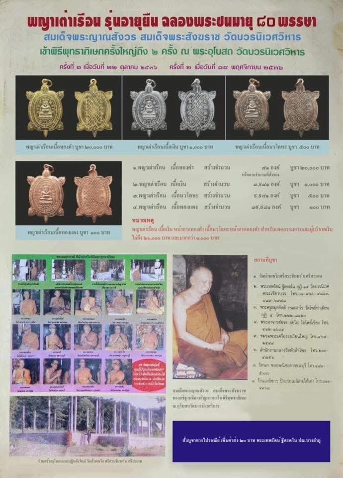ในวาระอันเป็นมงคลฉลองพระชนมายุ ๘๐ พรรษสมเด็จพระญาณสังวร ปี ๒๕๓๖ วัดบวรนิเวศวิหาร ได้จัดสร้างพญาเต่าเรือน รุ่นอายุยืนขึ้นเป็นรุ่นแรก เพื่อหาทุนรวมสร้างอุโบสถและกุฏิ วัดบ้านเขวิก ศรีสระจันทร์ ศรีสะเกษ พิธีพุทธาภิเษกเป็น ๒ วาระ ณ พระอุโบสถ วัดบวรนิเวศวิหาร สมเด็จพระญาณสังวร ทรงเป็นประธานพิธี จุดเทียนชัย และร่วมอธิฐานจิต