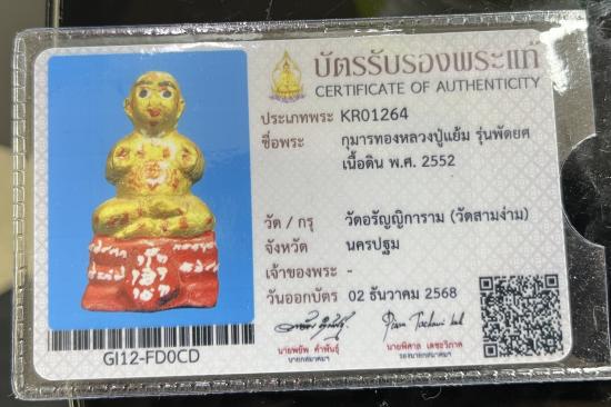 กุมารทองหลวงปู่แย้ม รุ่นพัดยศ เนื้อดิน ปี2552 วัดสามง่าม จ.นครปฐม พร้อมบัตรรับรองสมาคมฯ