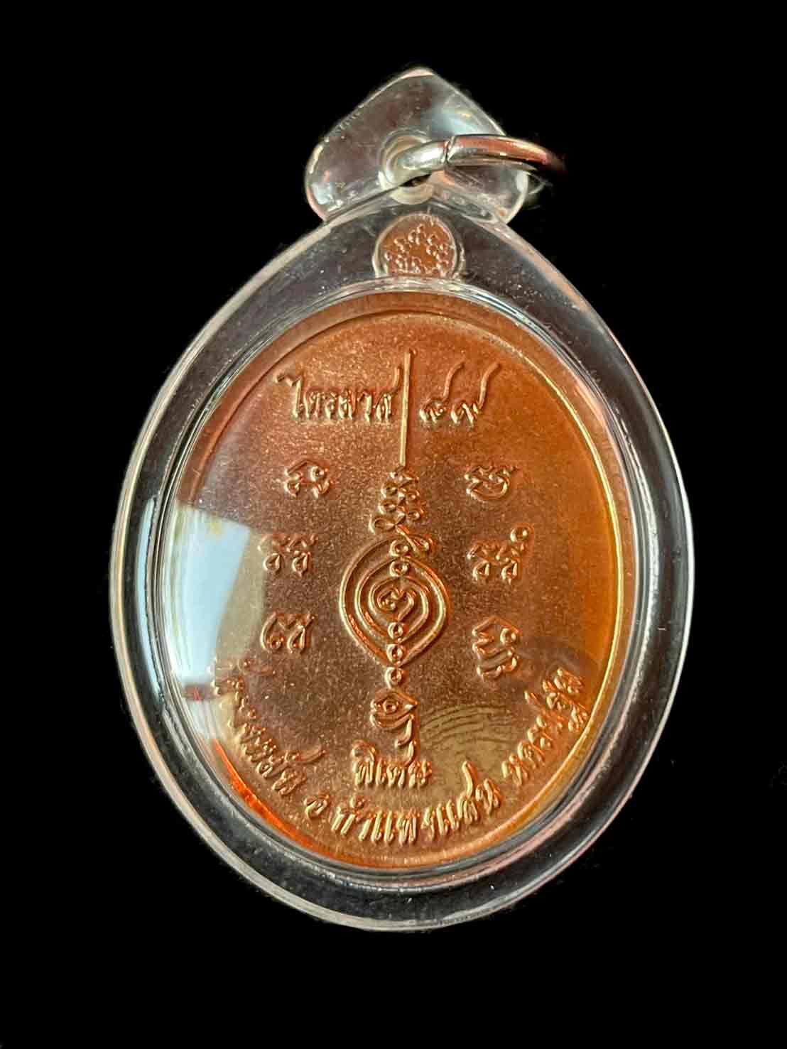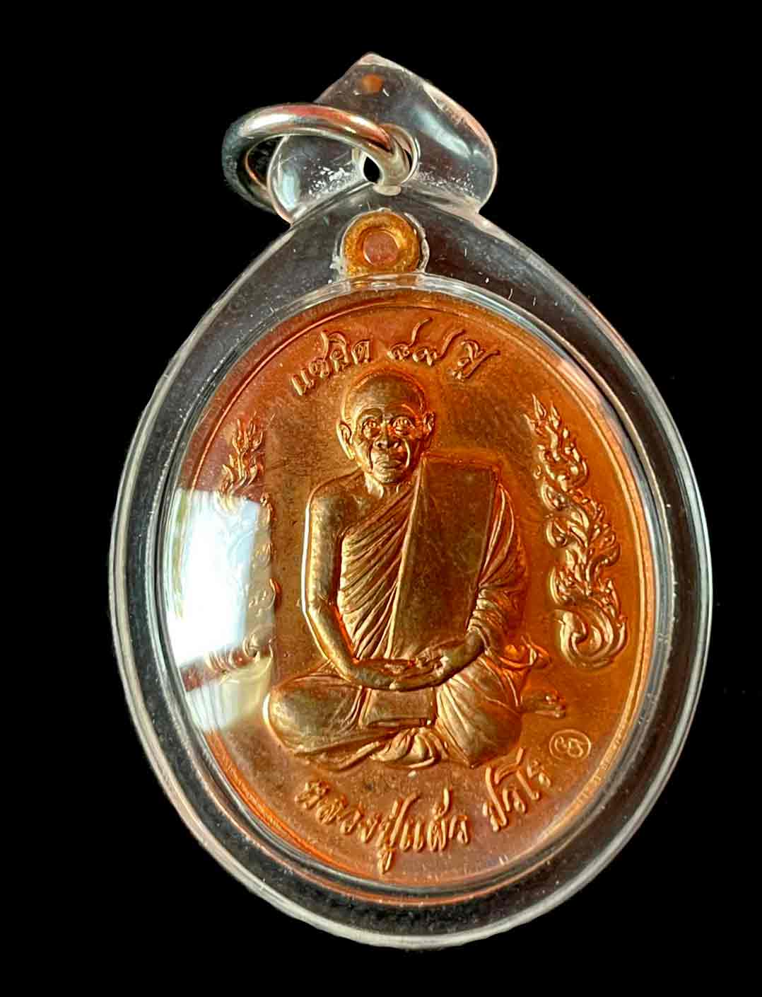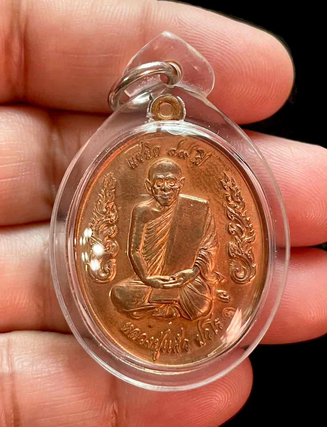 วัดใจ เหรียญกนกข้าง แซยิด 89 ปี หลวงปู่แผ้ว วัดรางหมัน จ.นครปฐม เนื้อทองแดง 2554 ตอกโค๊ต เลี่ยมพลาสติก สวยงาม