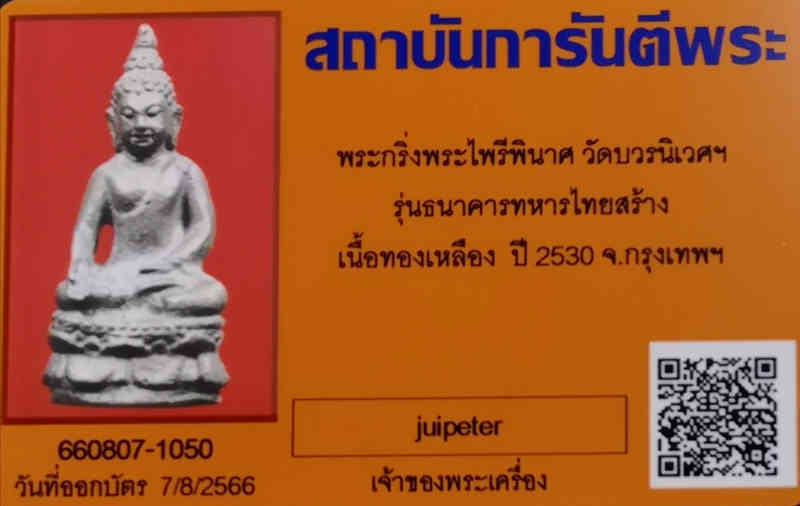 พระกริ่งพระไพรีพินาศ วัดบวรนิเวศ รุ่นธนาคารทหารไทยสร้าง เนื้อทองเหลือง ปี 2530 พร้อมบัตรรับรองการันตรีพระ