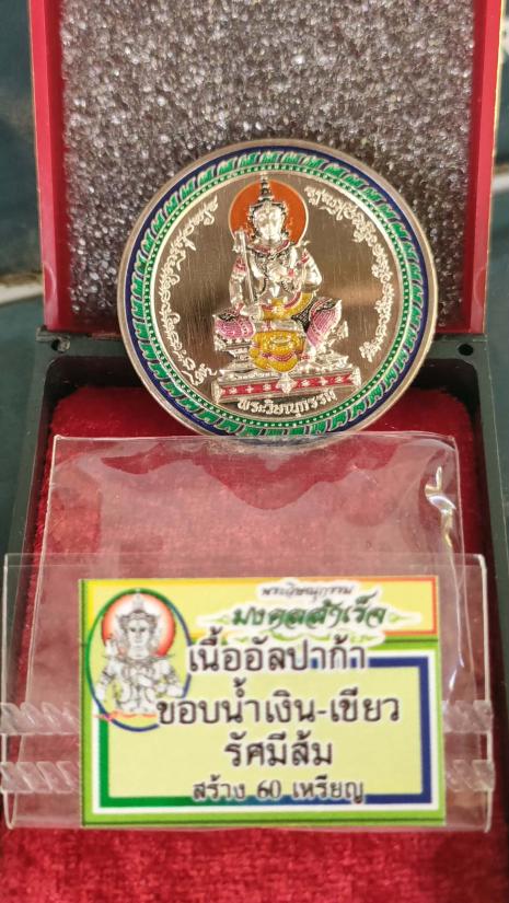 เหรียญพระวิษณุกรรม รุ่นมงคลสำเร็จ ออกวัดพระยาสุเรนทร์ กทม. เนื้ออัลปาก้า ขอบน้ำเงินเขียว รัศมีส้ม เลข ๑๒ พร้อมกล่อง 12เลขพ่อแม่ เกจิดังร่วมปลุกเสก ลป.มหาศิลา,ลป.สมบุญ,ลป.ธูป,ลพ.ชำนาญ ฯลฯ สายช่างไม่ควรพลาด