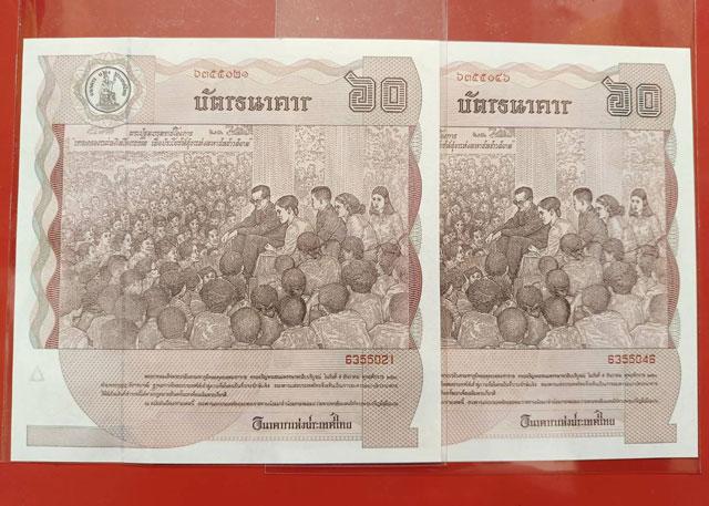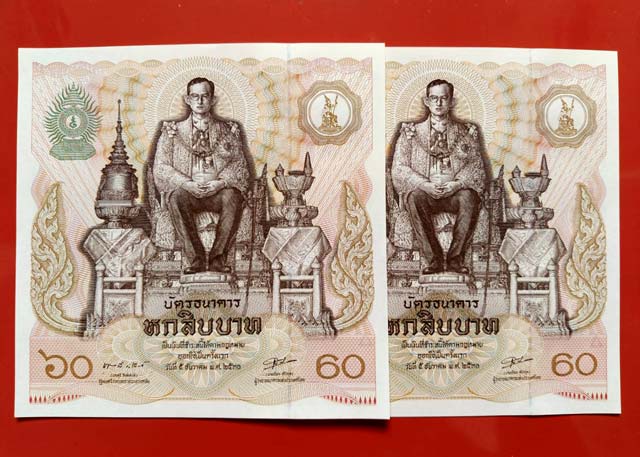 บัตรธนาคารเนื่องในมหามงคลสมัยที่พระบาทสมเด็จพระมหาภูมิพลอดุลยเดชมหาราช บรมนาถบพิตร ทรงเจริญพระชนมพรรษาหกสิบพรรษา 5 ธันวาคม 2530 ชนิดราคา 60 บาท จำนวน 2 ฉบับ