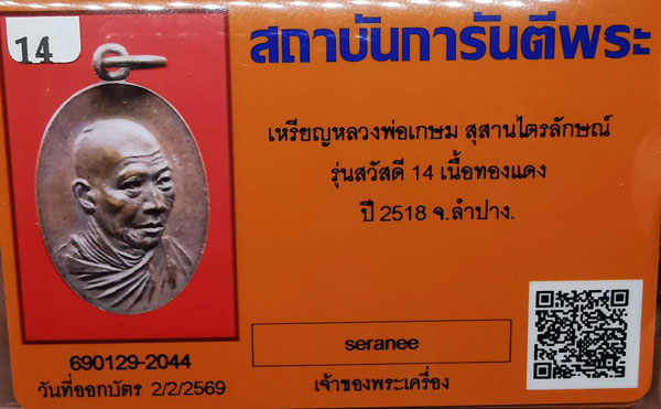 เหรียญหลวงพ่อเกษม สุสานไตรลักษณ์ รุ่นสวัสดี14 เนื้อทองแดง ห่วงเดิม ปี2518 จ.ลำปาง + บัตรG-pra สภาพสวยเดิมค่ะ สภาพตามรูปทุกประการค่ะ