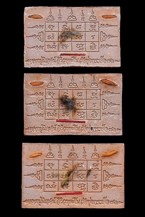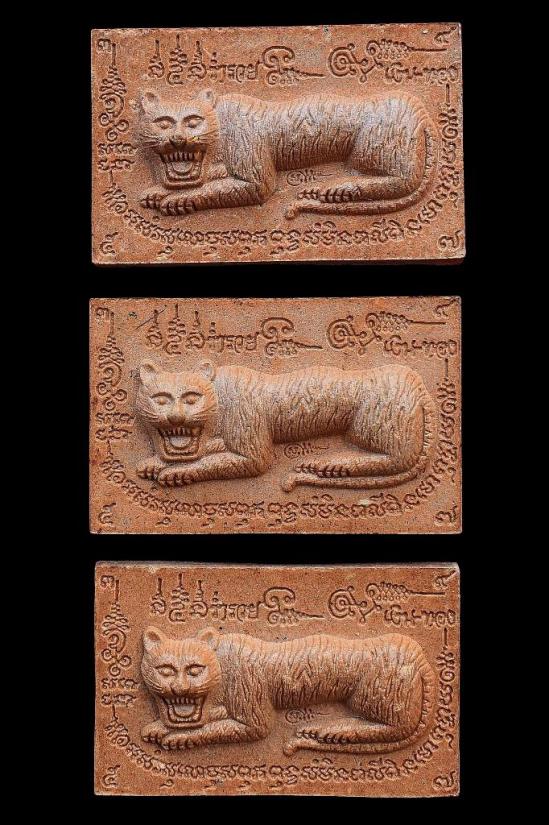 ชุด 3 องค์...เสือนอนกินทรัพย์สินพูนทวี เนื้อผงว่านยาคลุกน้ำมันเสือ หลังโรยขนเสือ + เม็ดข้าวนารอด + ก้านธูปเสก ปี 2551 หลวงปู่นิเวศน์ วัดทุ่งกระเจ็ด จ.สุพรรณบุรี พร้อมซองรูปใบฝอยเดิมจากวัด สภาพพระตามรูปที่ลงทุกประการ (ขนาดประมาณ 5.4 x 3.4 ซม.)