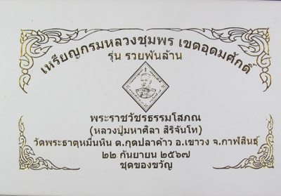 เหรียญกรมหลวงชุมพร " รวยพันล้าน" ศิษย์ทร. สร้างถวาย หลวงปู่มหาศิลา (หลวงปู่ศิลา) วัดพระธาตุหมื่นหิน กาฬสินธุ์ ชุดของขวัญ " ชุดของขวัญ