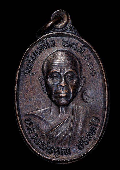 เคาะแรกแดง เหรียญรับเสด็จ หลวงพ่อคูณ วัดบ้านไร่ บล๊อค อ แตก เนื้อทองแดงรมดำ ปี 2536 |