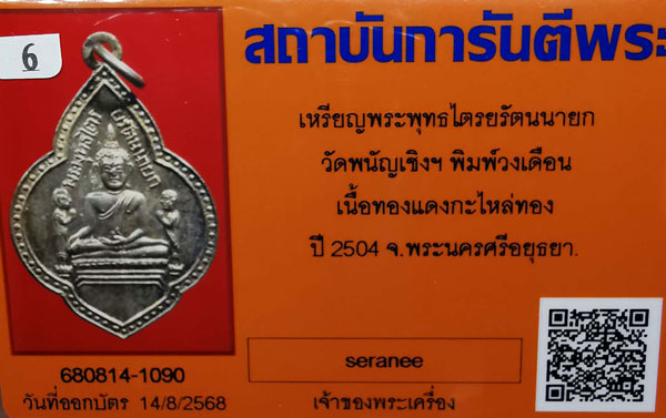เหรียญพระพุทธไตรยรัตนนายก วัดพนัญเชิงฯ พิมพ์หลังวงเดือน เนื้อทองแดงกะไหล่ทอง ห่วงเดิม ปี2504 จ.พระนครศรีอยุธยา + บัตรG-pra สภาพสวยเดิมค่ะ |