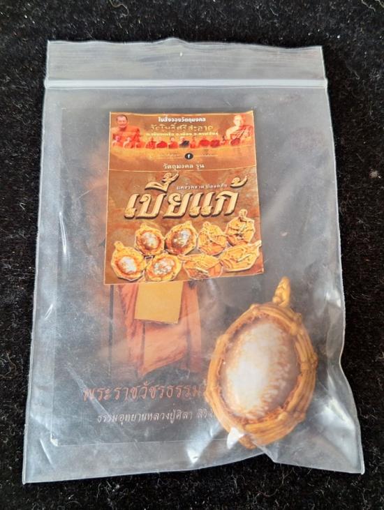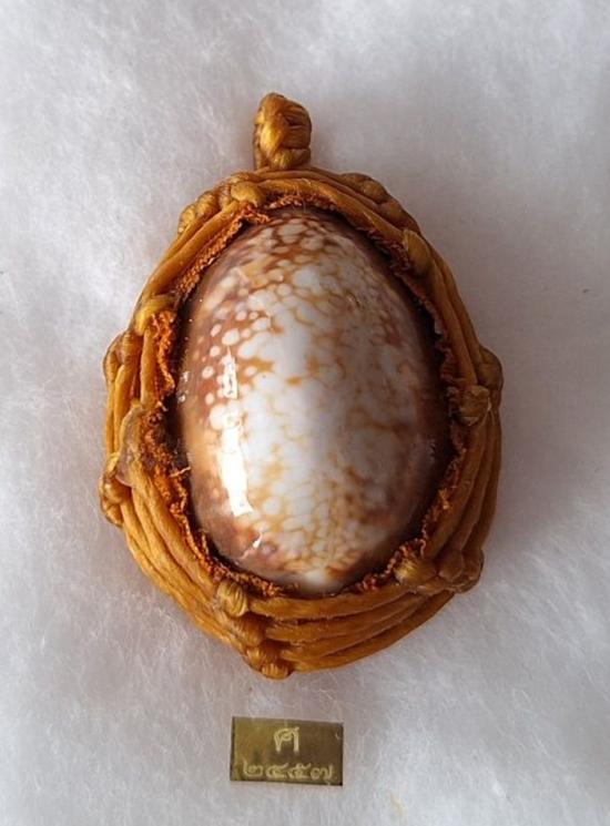 เบี้ยแก้ หุ้มจีวร ถักเชือก หลวงปู่ศิลา วัดโพธิ์ศรีสะอาด มีแผ่นเลขกำกับ ฝังตะกรุดทองเหลือง พร้อมใบคาถา ปี2567 |