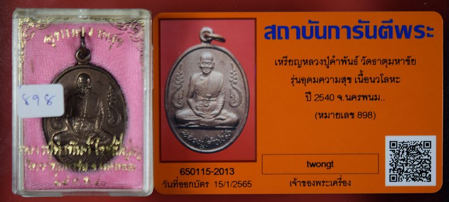 เหรียญหลวงปู่คำพัน วัดธาตุมหาชัย รุ่นอุดมความสุข เนื้อนวโลหะ หมายเลข 898 ปี 2540 จ.นครพนม พร้อมบัตรรับรองและกล่องเดิมๆ เคาะเดียวแดง |