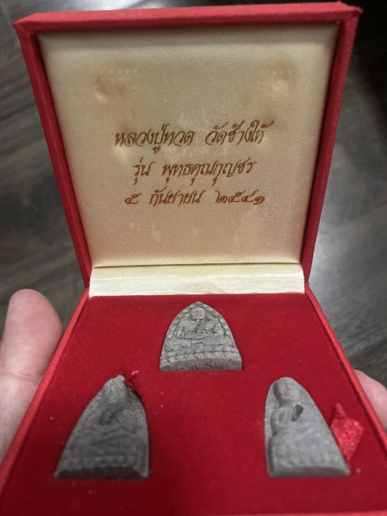ชุดหลวงปู่ทวด รุ่นพุทธคุณกุญชร เนื้อว่านผสมงาช้างแมมมอธ (ฝังตะกรุดเงิน) อยู่ในซีลเดิม ปี 2541 อาจารย์นองปลุกเสก พร้อมกล่องเดิม |