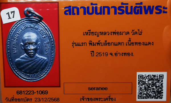 เหรียญหลวงพ่อผาด วัดไร่ รุ่นแรก พิมพ์บล็อกแตก เนื้อทองแดง ห่วงเดิม ปี2519 จ.อ่างทอง + บัตรG-pra สภาพเดิมค่ะ |