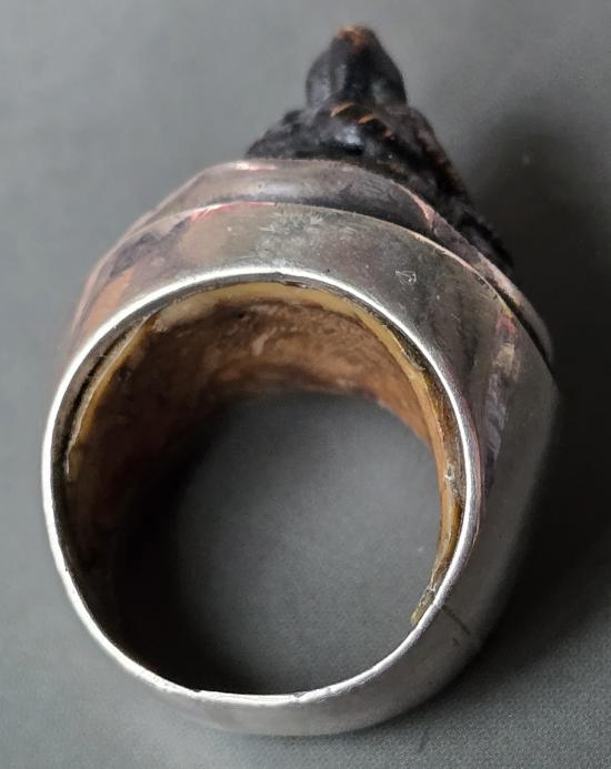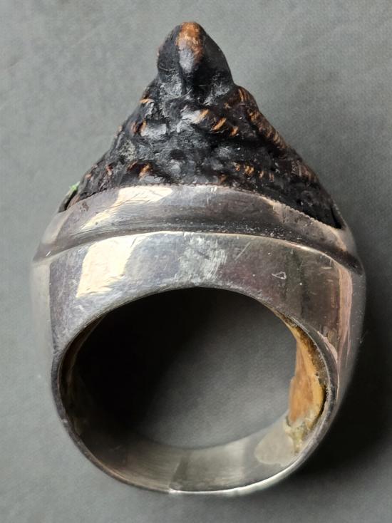 ท้องแหวนขาดไปเจ้าของทำเป็นตัวเรือนเงินมา และ ใส่งากระเด็นอุดใต้ท้องแหวนมาให้ด้วย ขนาดประมาณแหวนเบอร์ 60 หรือเส้นผ่านศูนย์กลางประมาณ 1.5 ซ.ม.