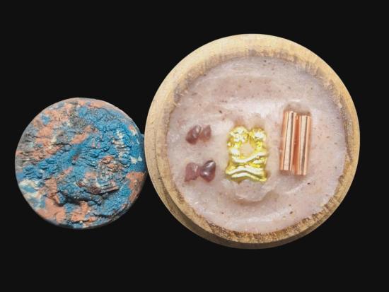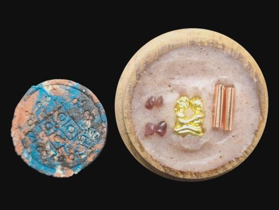 พญายูงคำ รุ่นแรก เนื้อก้นครก และ ตลับไม้สีผึ้งเนื้อหอม รังผึ้งร้าง ขวางเดือนขวางตะวัน รุ่นแรก ฝังอิ่น ตะกรุด ในเมตตาบารมี เจ้าปู่จั่นต่า กาวิสาละ พญานกยูง ขนาดเท่าเหรียญสิบบาท