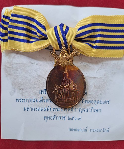 เหรียญที่ระลึกประดับแพรแถบ พระราชพิธีฉลองสิริราชสมบัติครบ 50 ปี ( กาญจนาภิเษก ) ปีพุทธศักราช 2539 เนื้อเงิน กะไหล่ทอง |