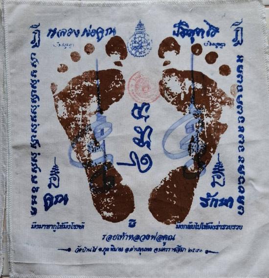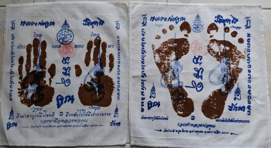มาคู่ ผ้ายันต์ รอยมือ + รอยเท้า หลวงพ่อคูณ ปริสุทโธ วัดบ้านไร่ นครราชสีมา ปั๊มตราวัด ปี 2551 เเบบสกรีน ( พร้อมรอยจารหลวงพ่อทองศิษย์หลวงพ่อคูณ วัดบ้านไร่ เมตาจารหมึกให้ครับ )