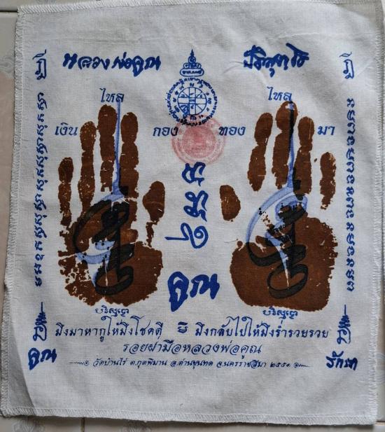 มาคู่ ผ้ายันต์ รอยมือ + รอยเท้า หลวงพ่อคูณ ปริสุทโธ วัดบ้านไร่ นครราชสีมา ปั๊มตราวัด ปี 2551 เเบบสกรีน ( พร้อมรอยจารหลวงพ่อทองศิษย์หลวงพ่อคูณ วัดบ้านไร่ เมตาจารหมึกให้ครับ ) |
