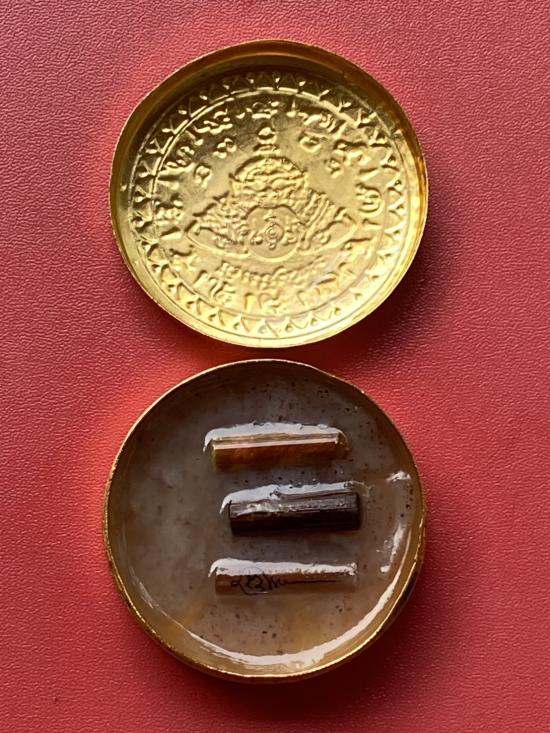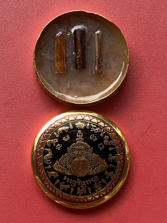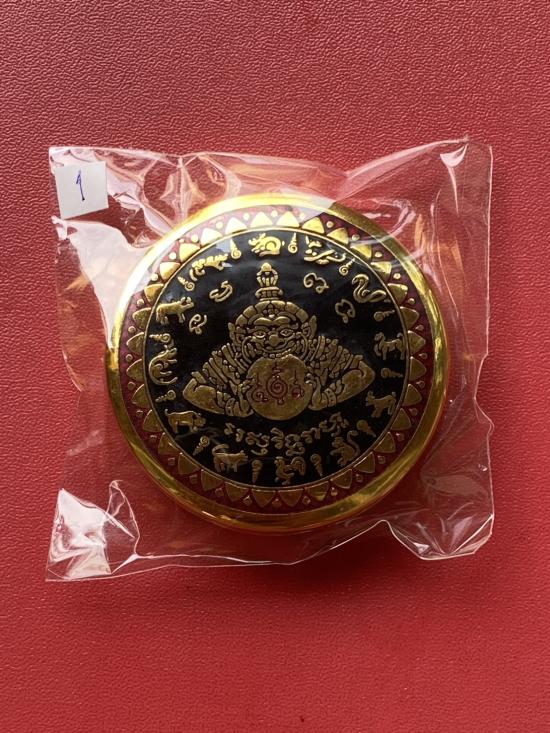 เคาะเดียวแดง สีผึ้งพระราหู รุ่น มงคลจักรวาล เนื้อ โลหะชุบทองลงยาสีดำขอบสีแดง ขนาด 5ซม