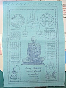 ๑๐๙-ผ้ายันต์ ลพ.เดิม วัดหนองโพธิ์ นครสวรรค์ รุ่นชนะความจนปี๕๓ สีฟ้าขนาด ๖x๘.๕นิ้ว |