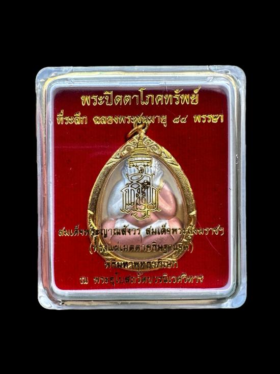 พระปิดตา 7 รอบ 84 พรรษา เนื้อโลหะชุบสามกษัตริย์ สมเด็จพระาณสังวร สมเด็จพระสังฆราช วัดบวรนิเวศวิหาร พร้อมเลี่ยมยกซุ้มสิงห์ชุบทอง+กล่องเดิม |