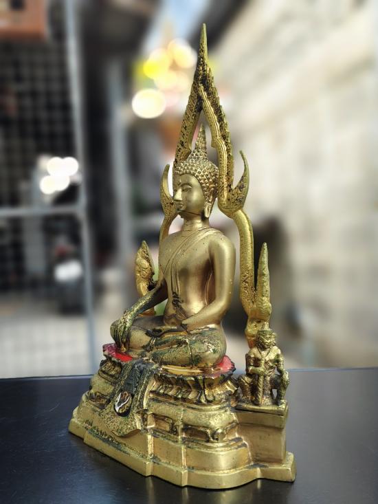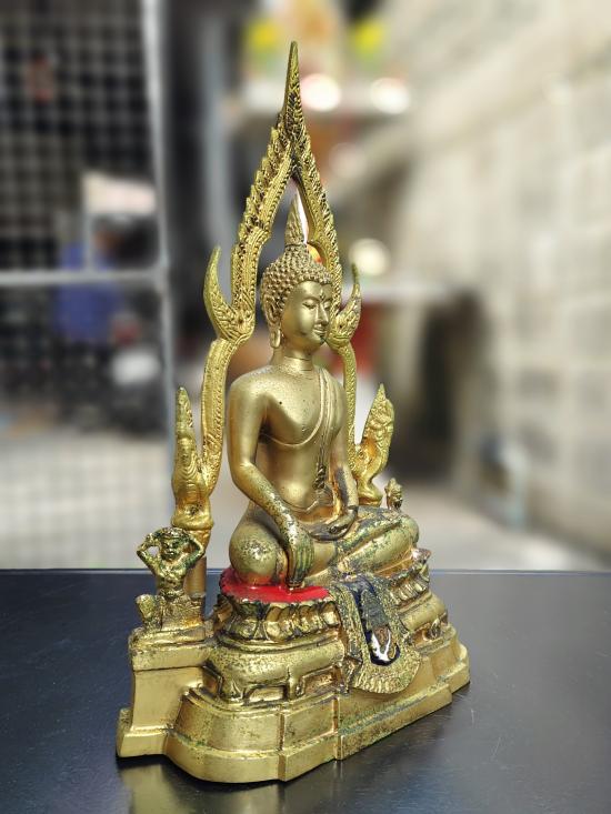 พระพุทธชินราช ภปร. เนื้อโลหะกะไหล่ทอง ประมาณปีสองห้าสามกว่า ซุ้มถอดได้ หน้าตักเกือบ 5 นิ้วหย่อนหน่อย มีหมายเลขประจำองค์ |