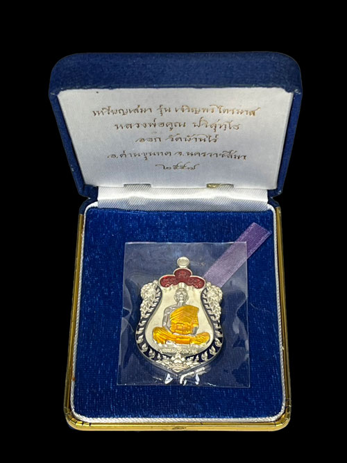 ''วัดใจ'' เหรียญเสมา รุ่นเจริญพรไตรมาส หลวงพ่อคูณ ปริสุทโธ วัดบ้านไร่ 2557 เนื้อเงินปะฉลุ 3 ชิ้น ลงยา 3 สี พื้นเงิน ขอบเงิน องค์เงิน หมายเลข 4