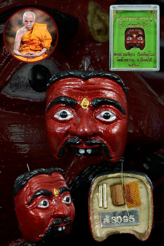 หน้าพราน รุ่นเพชร ทักษิณ เนื้อโลหะ หน้า แดง * หน้าพรานชุดนี้ ด้านหลังมีจีวรเกศา� * หลวงปู่เขียว มีตะกรุดเงินจารมือ. มีไม้รอดโบสถ์� |