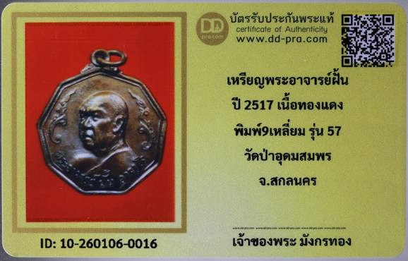 เหรียญรุ่น ๕๗ หลวงปู่ฝั้น อาจาโร ป่าอุดมสมพร จ.สกลนคร เนื้อทองแดงรมน้ำตาล ปี ๒๕๑๗ สวยเดิมครับ มีบัตรรับรองเว็บเพื่อนบ้านครับ |