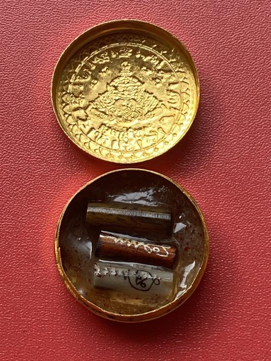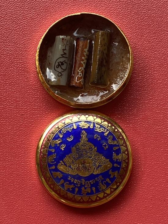 เคาะเดียวแดง สีผึ้งพระราหู รุ่น มงคลจักรวาล เนื้อ โลหะชุบทองลงยาสีน้ำเงิน ขอบสีแดง ขนาด3.2ซม |