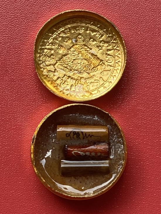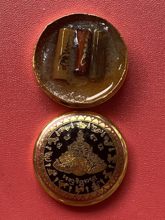 เคาะเดียวแดง สีผึ้งพระราหู รุ่น มงคลจักรวาล เนื้อ โลหะชุบทองลงยาสีดำขอบสีแดง ขนาด 3.2ซม |