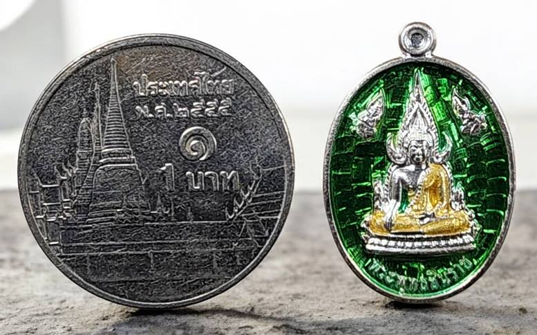 เหรียญเม็ดแตง พระพุทธชินราชหลังพระนเรศวร รุ่นมหาราช 118 ปี เนื้อเงินลงยา(สีเขียว) หมายเลข 71 สภาพสวยมากๆ พร้อมกล่องครับ