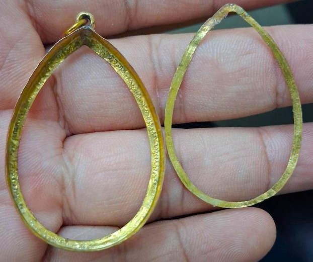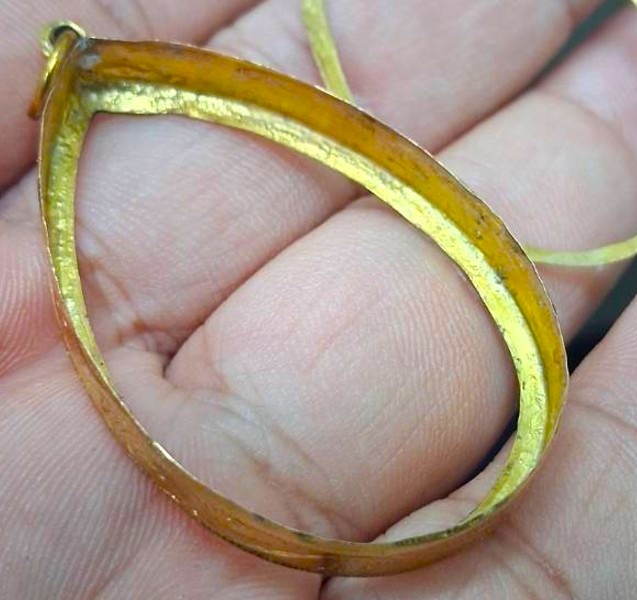 กรอบทองมือสอง ใส่เหรียญหลวงพ่อผางรุ่นแรก หลวงพ่อคูณ17 หลวงปู่ทวดรุ่น 2,4 และเหรียญทั่วไปที่ไกล้เคียง หน้าจอกว้าง 2.60 ซม., สูง 3.90 ซม. น้ำหนัก 1.56 กรัม เคาะเดียว