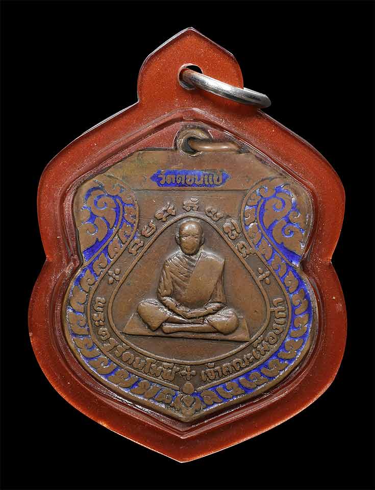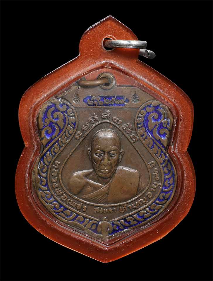 เหรียญรุ่นแรก หลวงพ่อเพชร วัดดอนแย้ จ.สงขลา ปี 2519 เนื้อทองแดงลงยาน้ำเงิน เลี่ยมพร้อมบูชา |