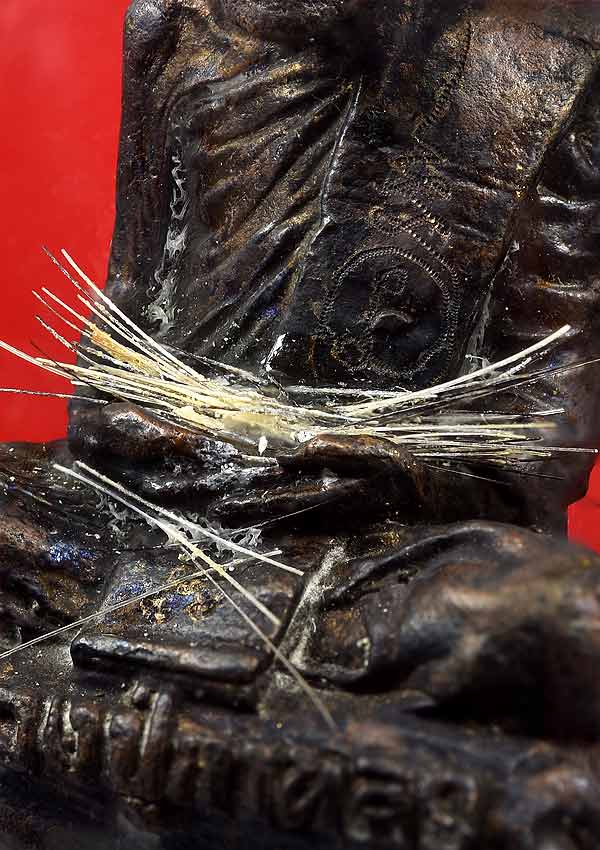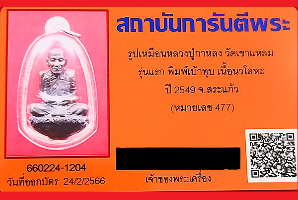 รูปหล่อโบราณ หลวงปู่กาหลง รุ่นแรก ปี 2549 มีโค๊ด และ เลข No.447 เนื้อนวโลหะขอมโบราณพันปี รุ่น ครอบเศียรพระลักษมณ์2549 "ใต้ฐานอุดผงปถมัง ปิดทับด้วยหนังเสือ ฝังเกศา จารยันต์ด้วยมือทั้งองค์ จำนวนสร้าง 4,999 องค์ |