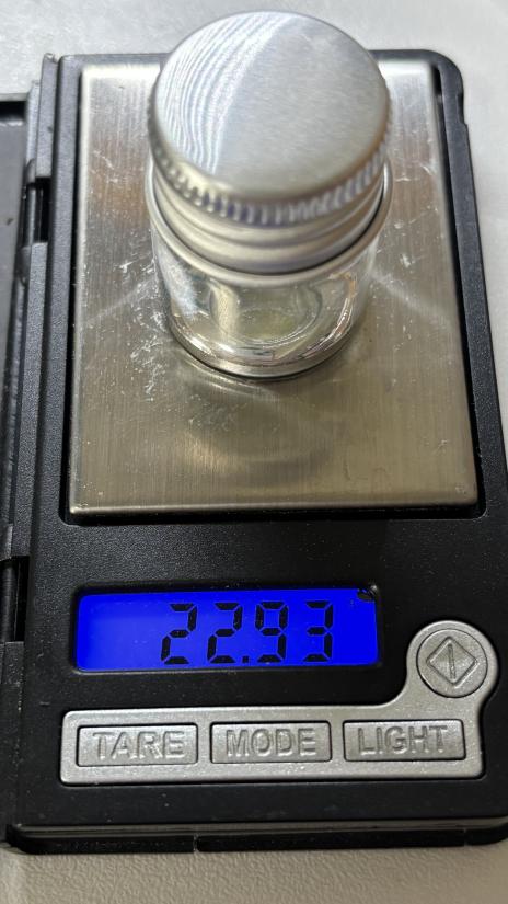 บรรจุใส่ขวด ขวดเปล่าหนักประมาณ 7.46กรัม ตัวปรอทน้ำหนัก 15.2 กรัม