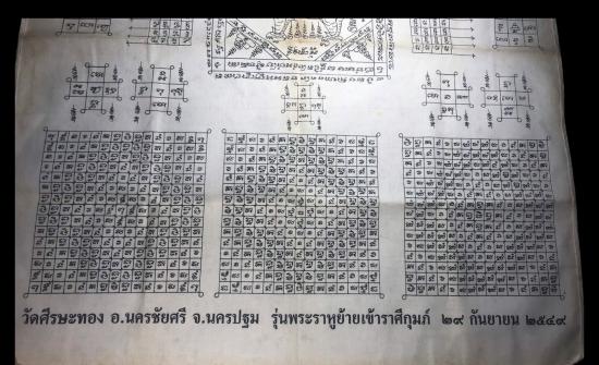 ผ้ายันต์..พระราหูครองทรัพย์ ตำรา .. หลวงพ่อน้อย วัดศรีษะทอง ต.ศรีษะทอง อ.นครชัยศรี ผืนใหญ่ ปี2549 |