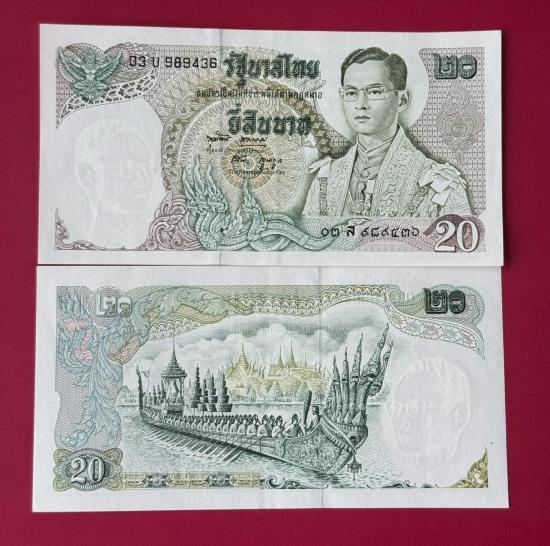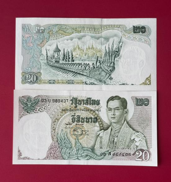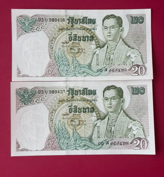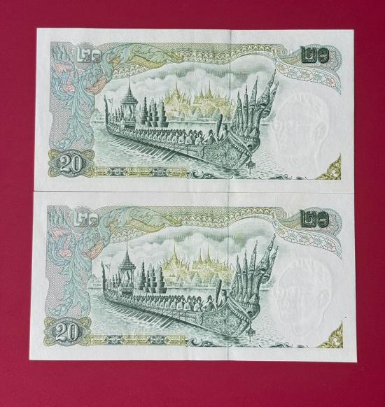 ธนบัตร 20 บาท รัชกาลที่ 9 หลังเรืออนันตนาคราช แบบ 11 จำนวน 2 ใบ สภาพตามรูป |