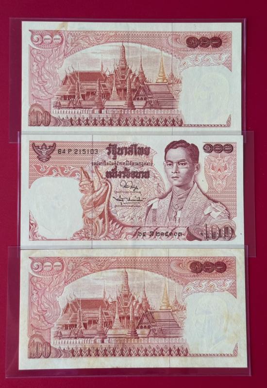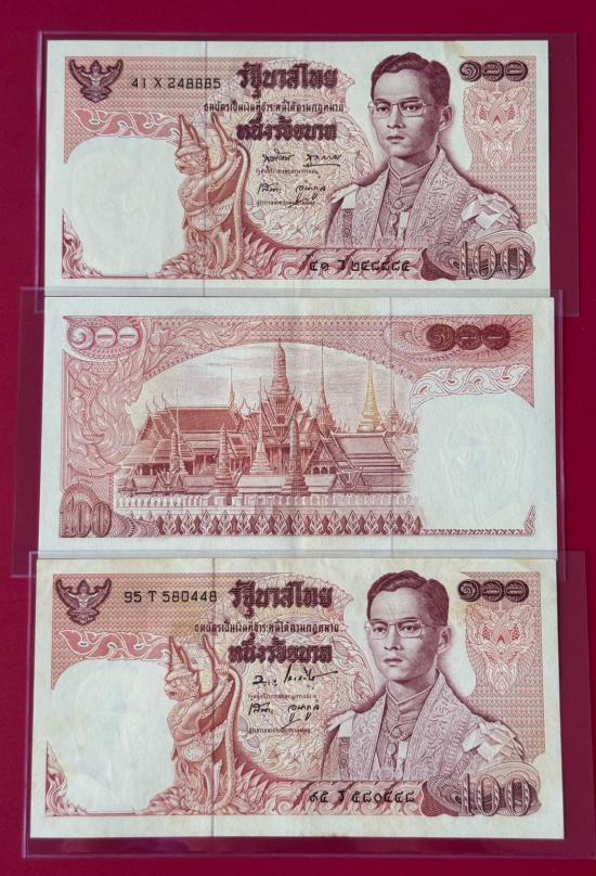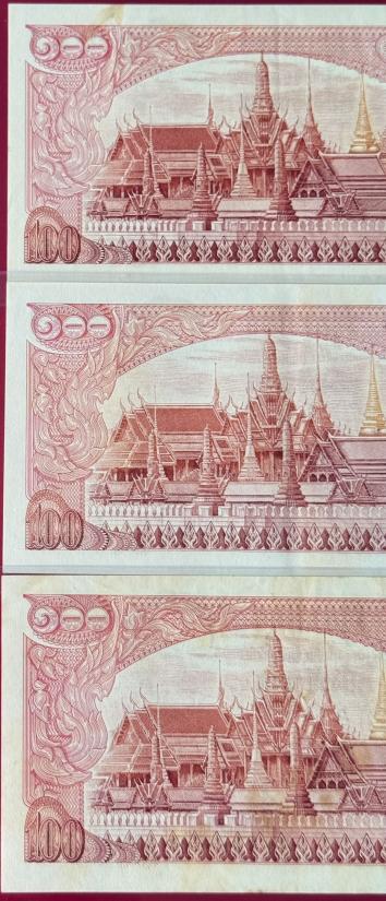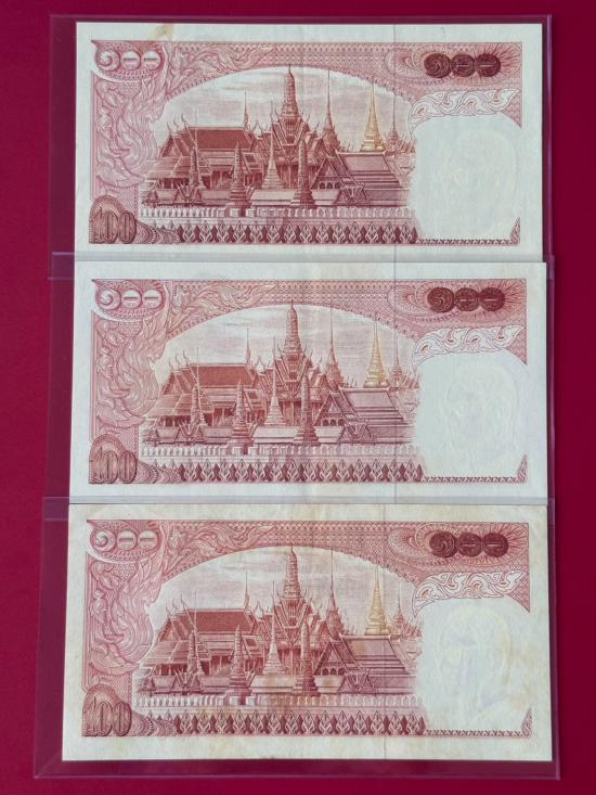 ธนบัตร รัชกาลที่ 9 ชนิด100 บาท แบบที่ 11 หลังวัดพระแก้ว จำนวน 3 ใบ สภาพตามรูป