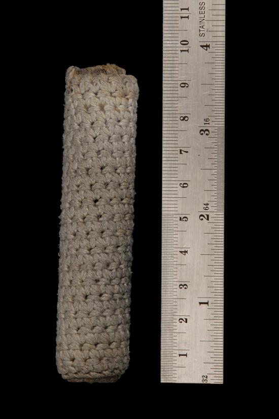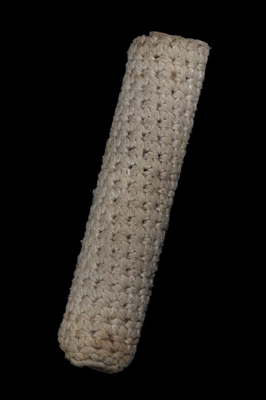 ไม่แพง เคาะเดียว ตะกรุดเนื้อตะกั่ว หุ้มด้วยหนังหน้าผากเสือ แล้วถักเชือกลายชานหมาก ยาว 3 นิ้ว 6 หุน ไม่ทราบที่ ไม่ทราบเกจิครับ |
