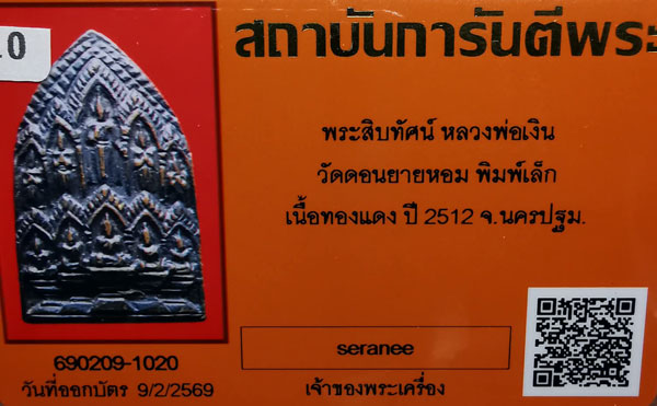 พระสิบทัศน์ หลวงพ่อเงิน วัดดอนยายหอม พิมพ์เเล็ก เนื้อทองแดง ปี2512 จ.นครปฐม + บัตรG-pra สภาพเดิมค่ะ