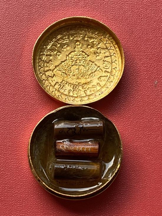 เคาะเดียวแดง สีผึ้งพระราหู รุ่น มงคลจักรวาล เนื้อ โลหะชุบทองลงยาสีดำขอบสีดำ ขนาด 3.2ซม |
