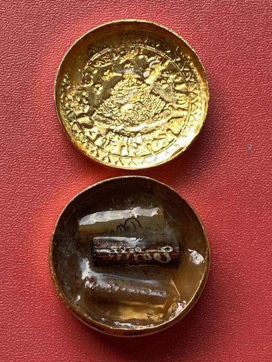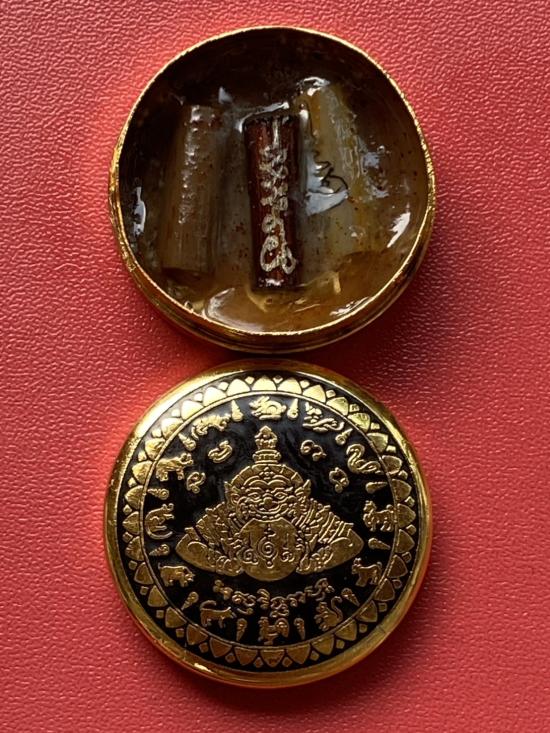 เคาะเดียวแดง สีผึ้งพระราหู รุ่น มงคลจักรวาล เนื้อ โลหะชุบทองลงยาสีดำขอบสีดำ ขนาด 3.2ซม |