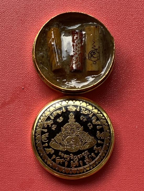 เคาะเดียวแดง สีผึ้งพระราหู รุ่น มงคลจักรวาล เนื้อ โลหะชุบทองลงยาสีดำขอบสีดำ ขนาด 3.2ซม |