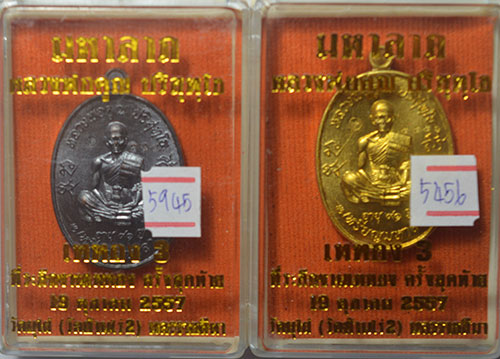 เหรียญหลวงพ่อคูณ วัดบ้านไร่ รุ่น มหาลาภ เททอง วาระ 3 ครั้งสุดท้าย ปี 57 เนื้อทองระฆัง เลข 5456 และทองแดงรมดำ เลข 5945 |